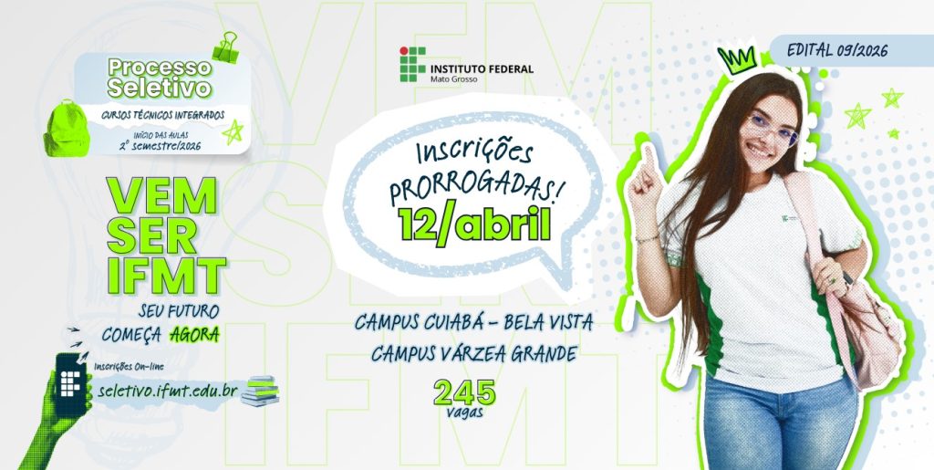 Inscrições prorrogadas até o dia 12 de abril para os cursos técnicos integrados ao ensino médio nos campi IFMT Bela Vista e Várzea Grande