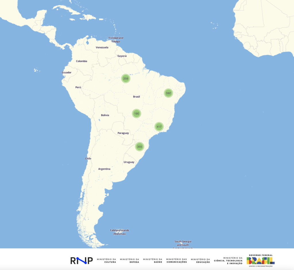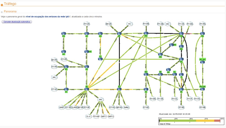 Informações sobre o nível de ocupação e taxas de latência em cada conexão da Rede Nacional de Ensino e Pesquisa (RNP) a nível nacional. Também estão disponíveis, nas mesmas páginas, os gráficos de ocupação dos enlaces de troca de tráfego com outras redes comerciais e públicas.