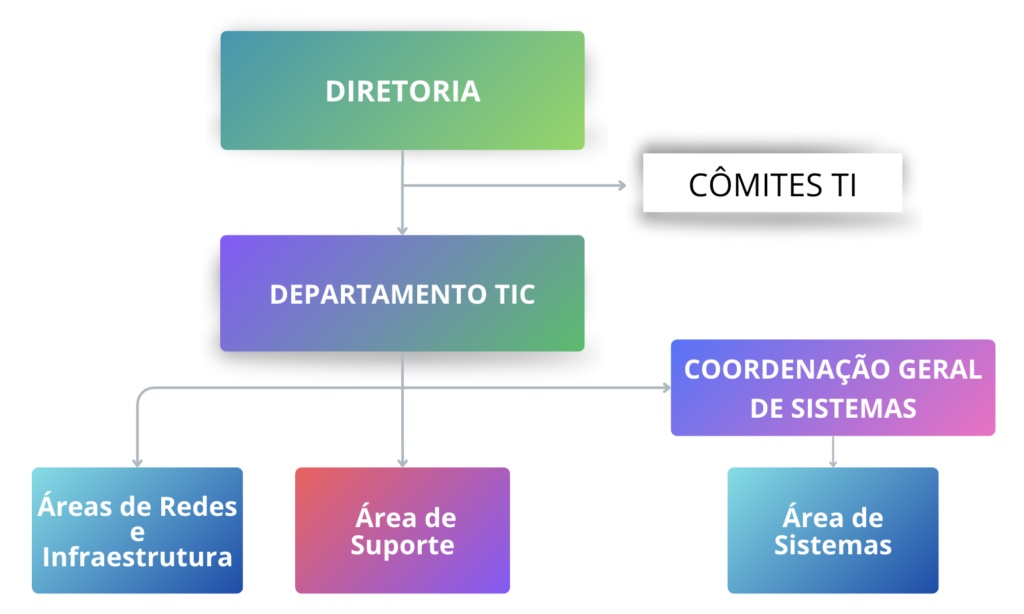 A Diretoria de Tecnologia da Informação compreende o Departamento de Tecnologia da Informação, que se divide internamente nas áreas de Redes e Infraestrutura e Suporte de TIC, e na Coordenação Geral de Sistemas, com a área de Sistemas.