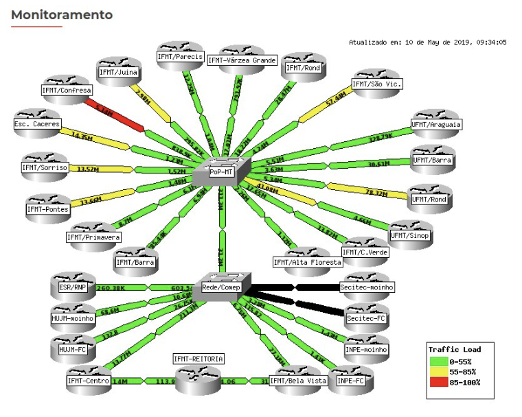 Informações sobre o nível de ocupação e taxas de latência em cada conexão da Rede Nacional de Ensino e Pesquisa (RNP) do estado de Mato Grosso, informação cedida pelo ponto de presença (POP) RNP em Mato Grosso.