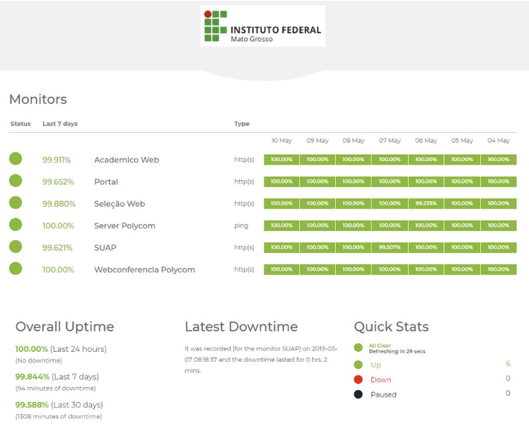 Com o propósito de obter um monitoramento pró-ativo da disponibilidade dos principais serviços do IFMT, foi utilizado um sistema que monitora constantemente este critério.